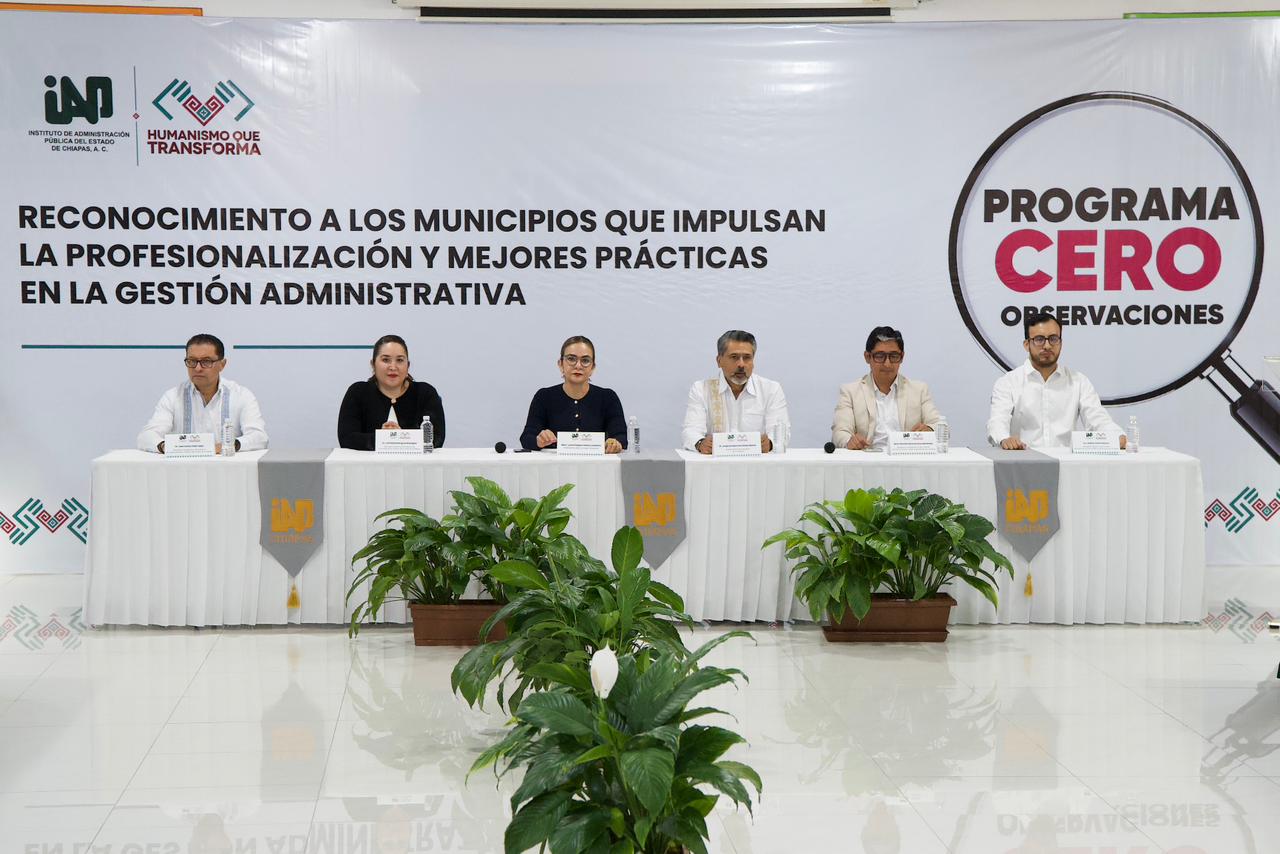 En su mensaje de bienvenida la presidenta del IAP Chiapas, expresó que los municipios que reciben reconocimientos por su participación y fortalecimiento de capacidades dentro del programa “Cero Observaciones” son: Arriaga, Alejandro Aquiles Patrinos Fernández; Berriozábal, C. Jorge Arturo Acero Gómez; Chilón, C. Mario Hernández Aguilar; Comitán de Domínguez, C. Mario Antonio Guillen Domínguez; Escuintla, C. Carlos González Moreno; Huehuetán, C. Sixto López Pérez; La Independencia, C. Jhony Sebastián López López; Ocosingo, C. Manuela Angélica Méndez Cruz; Solosuchiapa, C. Fernando Aparicio Gómez; Tonalá, C. Manuel de Jesús Narcia Coutiño; Tuzantán, C. Grissel Vázquez Zambrano; Villa Comaltitlán, C. Gerardo Pérez Gómez; Tecpatán, C. Cesar Edgar Marín Gómez.
